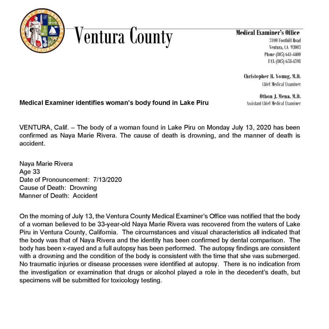 Ventura County Sheriff On Twitter The Attached Document Was Just Released By The Ventura County Medical Examiner S Office Regarding Naya Rivera Whose Body Was Found Yesterday In Lake Piru Https T Co Tmn1dfizyu