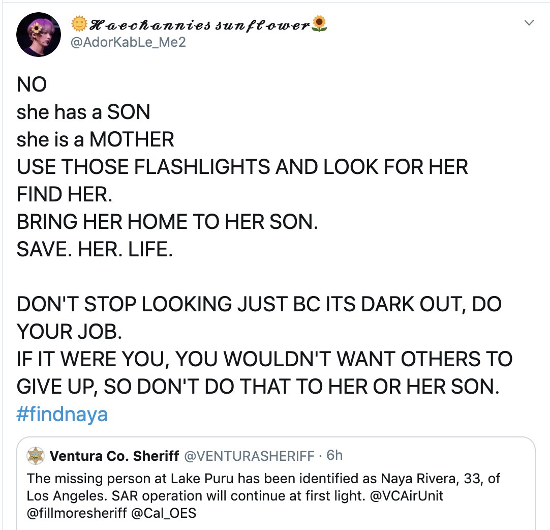 While giving an update on the search for missing Glee star Naya Rivera the Ventura County Sheriffs Office say they hope to provide closure for her family. 1372020 Naya Rivera s fans and supporters sharply criticized the Ventura County Sheriffs Office for posting a tweet on Sunday July 12 with an insensitive tone. Glee star Naya Riveras 4-year-old son told investigators that his mother heaved him back on the deck of their rented boat before she disappeared under the water.