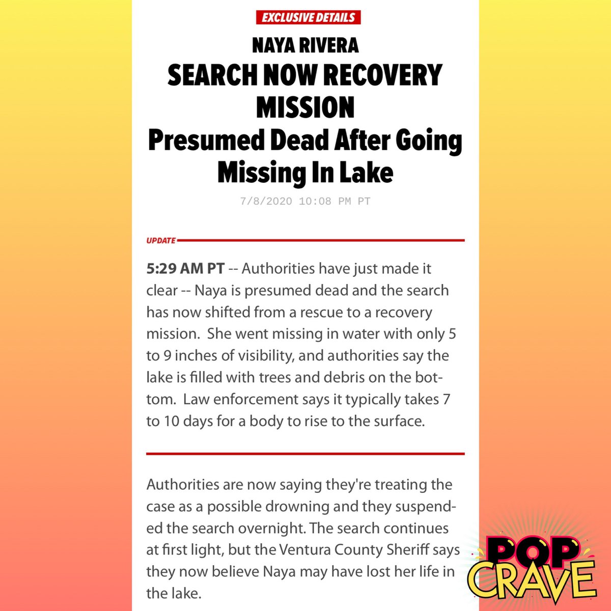 Pop Crave On Twitter Authorities Are Now Presuming Naya Rivera To Be Dead After She Went Missing In A Lake Yesterday Tmz Reports The Rescue Mission Has Become A Recovery Mission